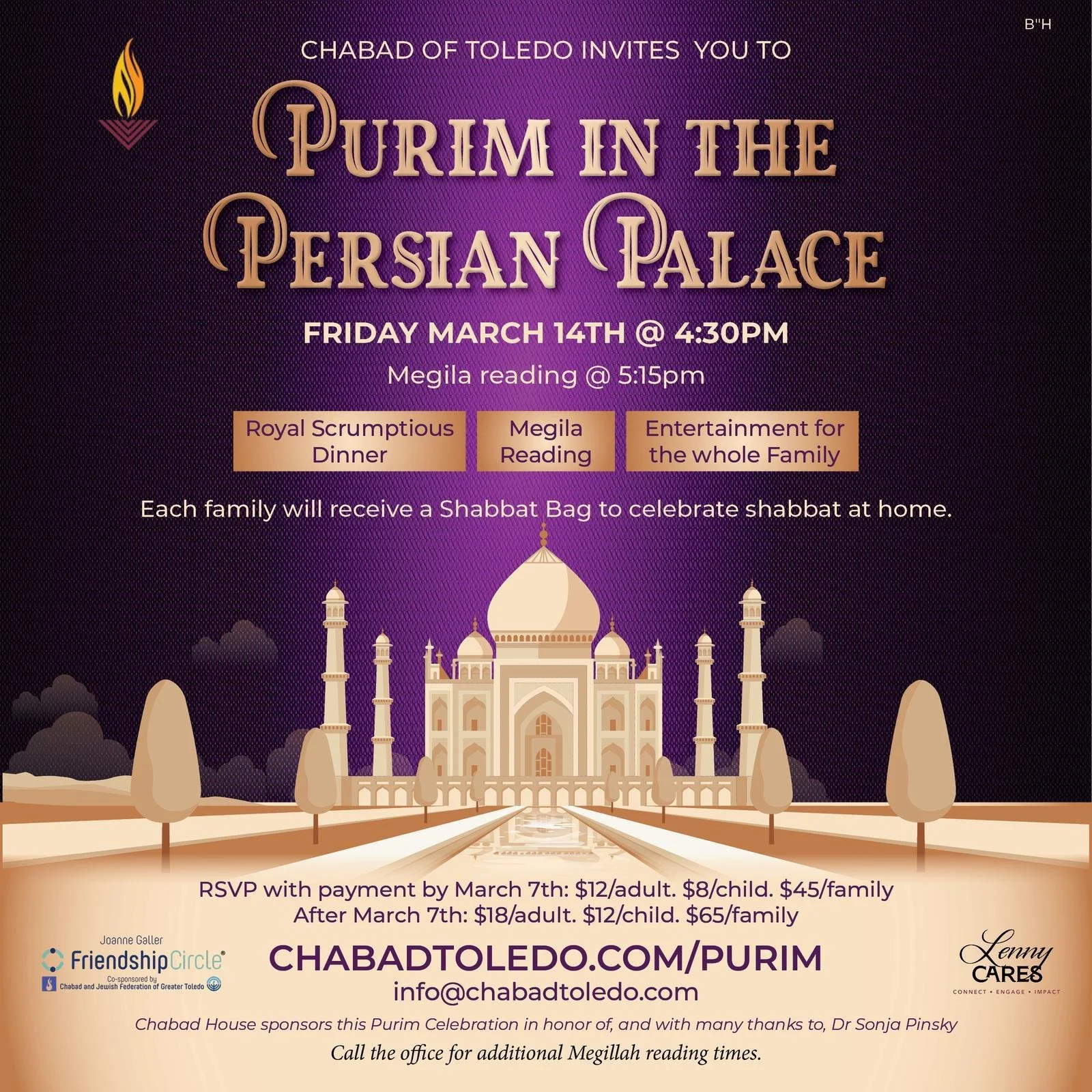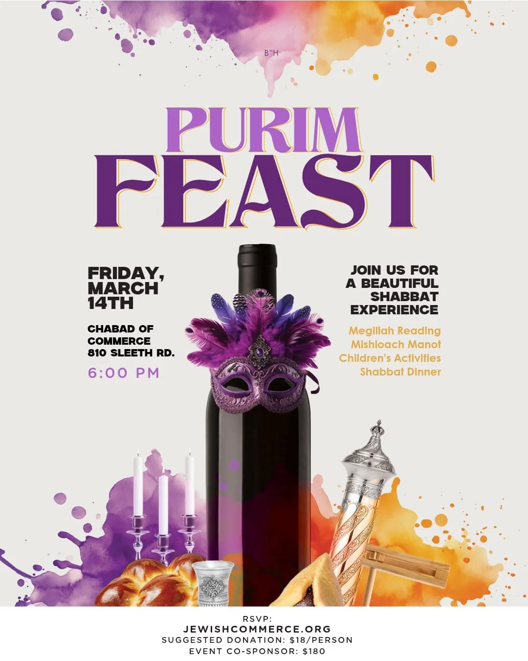 Find a Purim Celebration Near You! The Shul - Chabad LubavitchThursday, March 13 - 7:45 pmPurim NightFriday, March 14 - 5:30 pmBlack Tie Purimtheshul.net/PurimChabad in the DThursday, March 13 - 7:30 pmPurim 313 Comedy NightThe Eastern, DetroitRequest Invitation: Chabadinthed.orgFriendship CircleFriday, March 14 - 12:30 pmPurim in the 60sContact UsHuntington WoodsContact UsChabad Jewish Center of WaterfordFriday, March 14 - 5:00-6:45 pmPurim Feastjewishwaterford.org Chabad of ToledoFriday, March 14 - 4:30 pmMegillah reading - 5:15 pmPurim in the Persian Palacechabadtoledo.com/purimChabad of Bingham FarmsFriday, March 14 - 5:30 pmShab-PurimRSVP required: chabadbinghamfarms.com/shabpurimChabad Jewish Center of CommerceFriday, March 14 - 6:00 pmPurim FeastRSVP: jewishcommerce.orgChabad of LivoniaFriday, March 14 - 4:30 pmPurim in Israelchabadlivonia.com/purimChabad Jewish Center of NoviFriday, March 14 - 6:00 pmMore Info Chabad Jewish Center of TroyFriday, March 14 - 4:30 pmPurim in the Jungle!RSVP: jewishtroy.com/purimjungle Learn more about Purim Bingham Farms Commerce Detroit Friendship Circle Adult Volunteers Livonia The Shul - Chabad Lubavitch Toledo Waterford Novi Troy